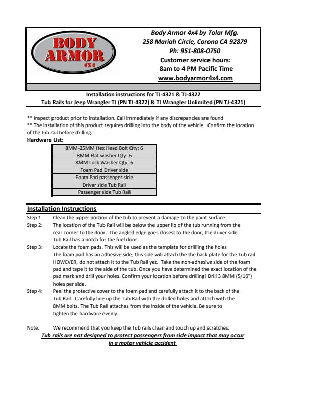 Body Armor Body Tub Rails, Steel, Powdercoated Black, Set of 2. Constructed of 1.75 in. diameter 0.12 wall tube welded on to sheet metal back plate for strength. Features a bolt-on style. Designed to protect the vehicles TUB from trail damage. Allows you to lean your vehicle against a rock or tree without the fear of tearing up your vehicles exterior body. Requires some drilling.