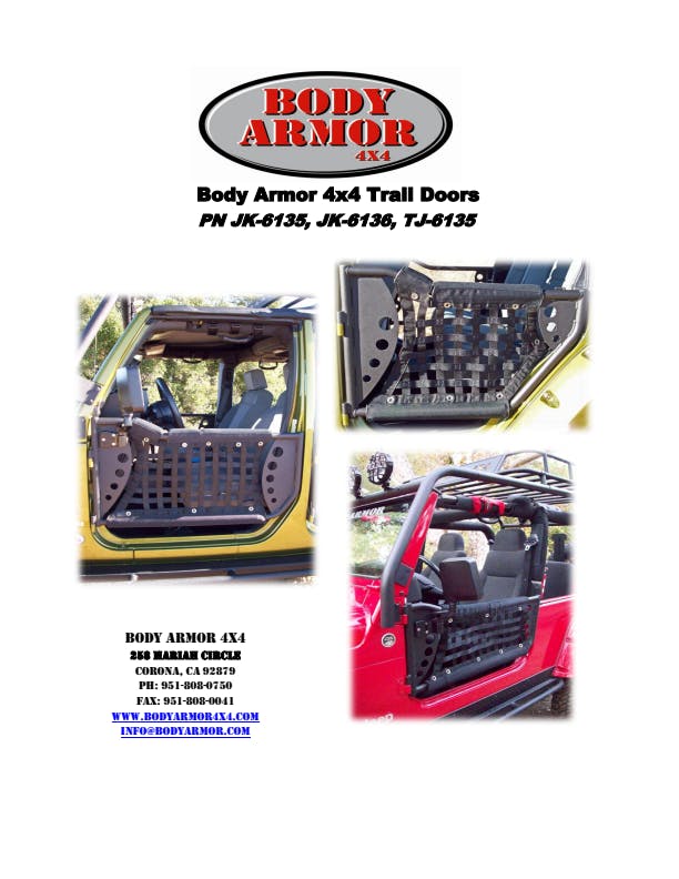 Body Armor Trail Doors, Steel, Powdercoated Black, Set of 2. With strong 1 in. wide, 1/8 in. thick woven nylon web door inserts for added protection from trail debris and additional padding for comfort. Made of durable steel tubing. Features exclusive steel plate gusset plates for style and strength and exclusive hidden internal latch mechanism designed for secure closure. Door height engineered for comfort. Simple installation, just take your factory doors off and slide the trail doors into the factory hinge. No need to modify the latch post. Pre-drilled for optional Body Armor 4x4 Mirrors.