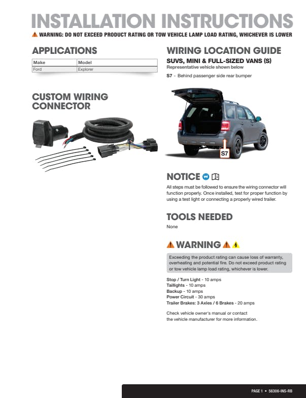 CURT custom wiring is made with some of the most sophisticated technology in the industry and is designed to install with ease, giving you a long-lasting electrical connection for your towing setup. If your vehicle is not equipped with wiring for towing a trailer, CURT custom wiring is the ideal solution. A custom wiring harness (also called a T-connector) is a simple, plug-and-play electrical device that plugs into your vehicle's electrical system and provides a standard trailer wiring connection. This is done using two or more vehicle-specific, OEM-compatible connectors to plug into the taillight assembly, eliminating the need for cutting, splicing and soldering during installation. Custom wiring harnesses are made vehicle-specific, and while they are not available for all vehicles, they do offer one of the fastest, easiest and most secure ways to wire a vehicle for towing. This particular harness provides a 7-way RV blade connector socket and is designed to be a custom wiring harness for certain years of the Ford Explorer and Police Interceptor Utility (see application info to verify fitment). It comes with all necessary wiring components to establish a reliable trailer wiring connection, as well as a dust cover to keep the connector clean when not in use. You have a picture in mind of your next destination -- maybe it's the boat landing at your favorite fishing spot, maybe it's a campsite that overlooks one of nature's masterpieces, or maybe it's the next big jobsite. However, turning that picture into a reality takes more than just daydreaming. It takes a solid connection and the right amount of power.